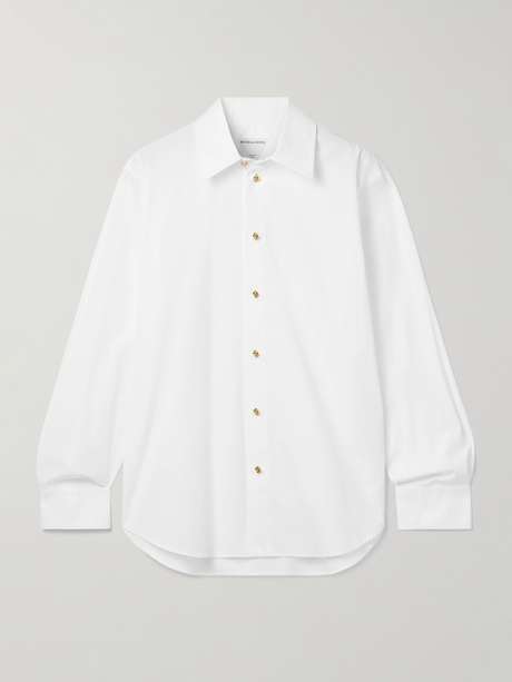 Bottega Veneta’s shirt fastens with gleaming gold-tone knots, the same of which can be found on many of the brand’s accessories. It’s been tailored in Italy from crisp cotton-poplin and has a rounded hem for smooth tucking.