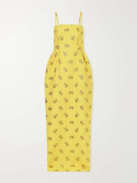 For Spring Summer '26, Carolina Herrera looks to Madrid's “unique approach to beauty”. Patterned with Lurex floral motifs that beautifully catch the light, this dress is cut from crisp crepe with a fitted bodice, before a sculptural waist creates exaggerated volume and falls to a sweeping hem.
