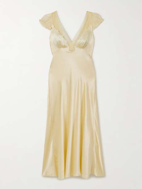 DÔEN's elegant 'Corelia' dress is inspired by nightgowns from the '30s. It's made from fluid silk-satin and has delicate tulle trims along the neckline and sleeves. Accessorize it with sandals and understated jewelry.