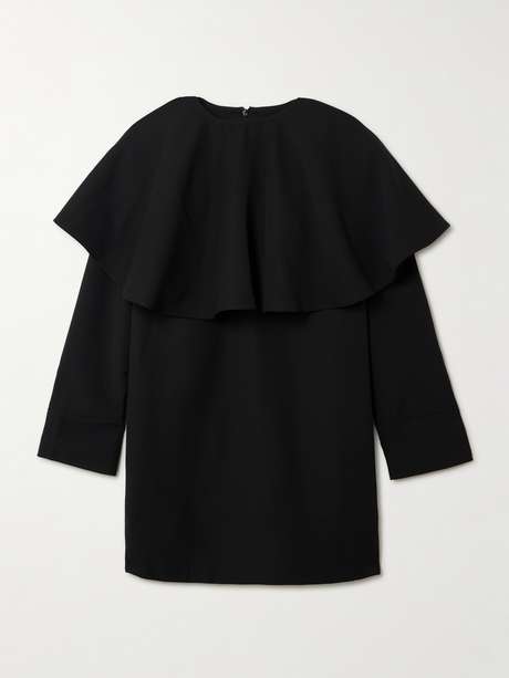 "It's an invitation to reconnect with spaces that make your heart feel most at ease," says Creative Director Ditte Reffstrup of GANNI's Fall '25 collection, which draws from the rich, comforting details of interiors from bygone eras. Worn on the runway, this mini dress is made from twill with a ruffled, cape-effect collar that can be removed, depending on the occasion.