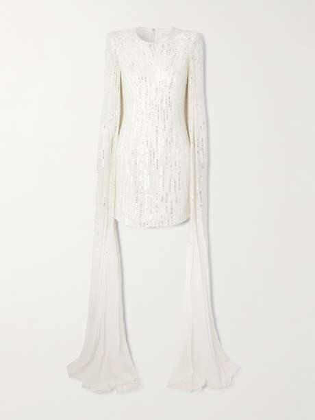Jenny Packham's 'Sweet Magic' dress promises maximum sparkle on the dance floor, making it perfect for your wedding reception. Cut from tulle covered in scores of sequins and crystals, it has structured shoulders and floor-grazing sleeves that create a dramatic cape-effect overlay.