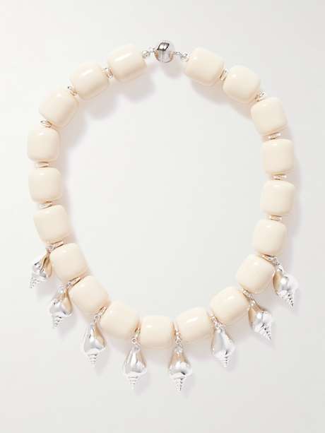 The iconic style of Christian Lacroix and Elsa Schiaparelli often inspires Julietta's designs. Made from silver-plated brass, this 'Odeon' necklace is strung with chunky resin beads and interspersed with dangling shell pendants. Frame yours with a scooped neckline.