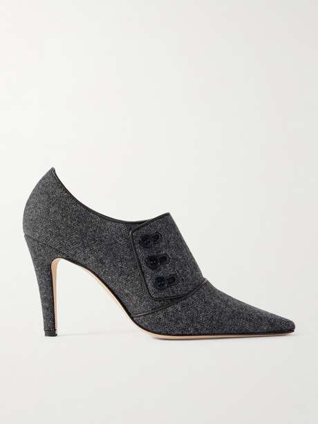 The button detail on Manolo Blahnik's 'Perluja' pumps nods to classic tailoring. They're made from tonal-gray tweed with black leather trims and elegant pointed toes.