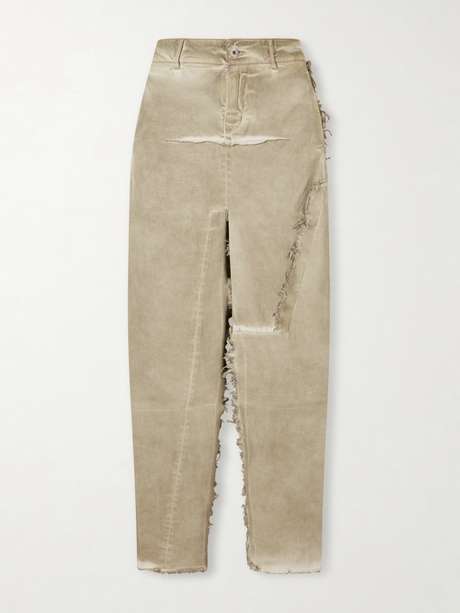 Each Rick Owens collection is packed with wardrobe staples delivered with fresh twists. This midi skirt is cut from distressed denim and has fraying to mirror the look of a lived-in favorite. Wear it with chunky boots.
