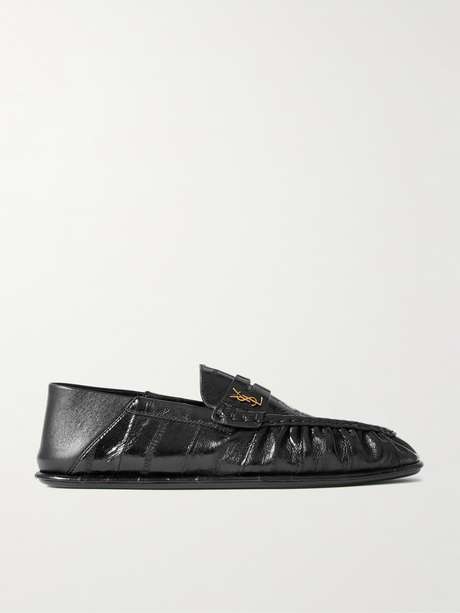SAINT LAURENT’s signature loafers are refreshed with smooth collapsible heels, so you can style them as slippers too. Made in Italy from glossed-eel, they are ruched around the toes and embellished with a gold 'Cassandre' plaque at the penny slots.