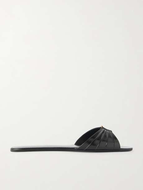 SAINT LAURENT’s 'Babylone' slides embody the house’s signature balance of architectural elegance and ease. They’re made from glossed-leather that’s gathered to frame the iconic gold-tone 'YSL' plaque.