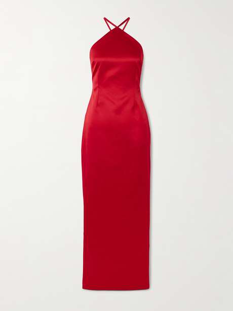 Solace London's 'Fern' gown makes dressing elegantly look effortless. Cut from duchesse-satin to hug your frame, it has a glamorous halterneck with straps that cross at the back and finish in tied bows. Turn to reveal this detail in photos.