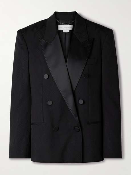 Stella McCartney's blazer is tailored for a boxy, oversized fit with a smart double-breasted front. It's cut from smooth black wool and has tonal satin trims recalling traditional tuxedo styles. Padded shoulders add structure.