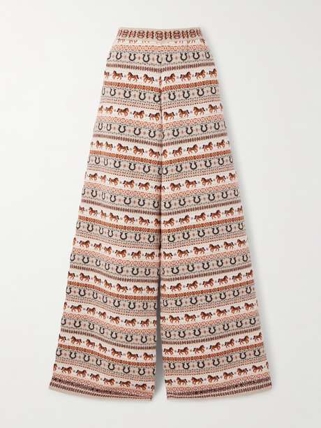 Stella McCartney loves horses and believes in their healing power. Made from wool, these wide-leg pants are knitted with rows of ponies and lucky horseshoes. Style yours with the coordinating scarf.