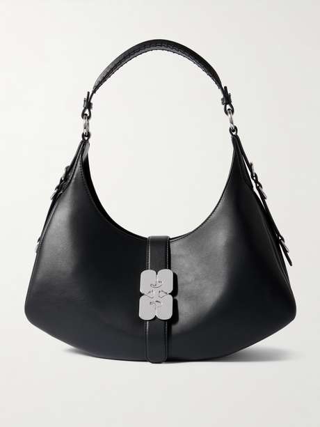 GANNI's 'Kat' bag is adorned with the signature 'Butterfly' hardware that doubles as a clasp. It's made from smooth leather in a saddle shape and has an adjustable shoulder strap. Inside fits your phone, mints and a set of keys.