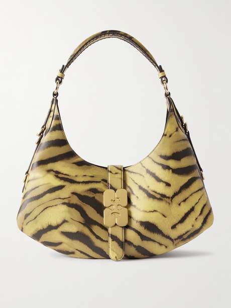GANNI's 'Kat' bag is adorned with the signature 'Butterfly' hardware that doubles as a clasp. It's made from lightly grained zebra-print leather in a saddle shape and has an adjustable shoulder strap. Inside, keep your phone, mints and a set of keys.