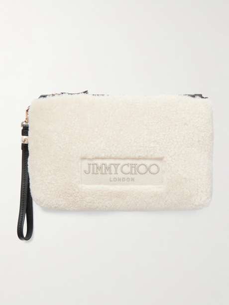 Jimmy Choo's clutch has been made in Italy from plush shearling with black leather trims to outline the shape. Embroidered with a tonal logo, it has a detachable faux pearl-embellished wrist strap and a slim interior that'll hold your phone, cards and lip balm.