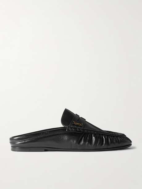 SAINT LAURENT's 'Le Loafer' mules are eternally chic. They've been made in Italy from supple leather that's gently gathered along the toes and are embellished with a gold 'Cassandre' logo plaque at the penny slots.