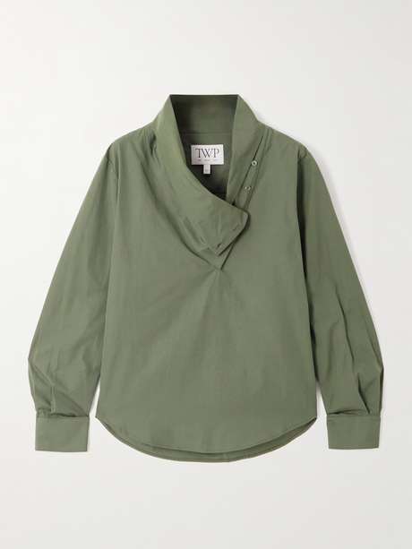 TWP's 'My Maria' blouse has an asymmetric collar that can be buttoned up or left loose. Made from crisp cotton-poplin, it has a generous fit and pleated, barrel cuffs.