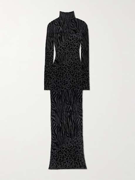 Alex Perry’s gown is bold and elegant. Made from animal-print devoré-velvet, it’s cut to skim the body with long sleeves and a sleek turtleneck. Style yours with statement earrings and stilettos.
