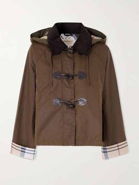 Barbour's designs draw on English heritage – and weather. Perfect for a drizzly forecast, this 'Myra' jacket is made from waxed cotton that's resistant to light showers. It has a hood for additional protection, a tartan lining and toggle fastenings through the front.