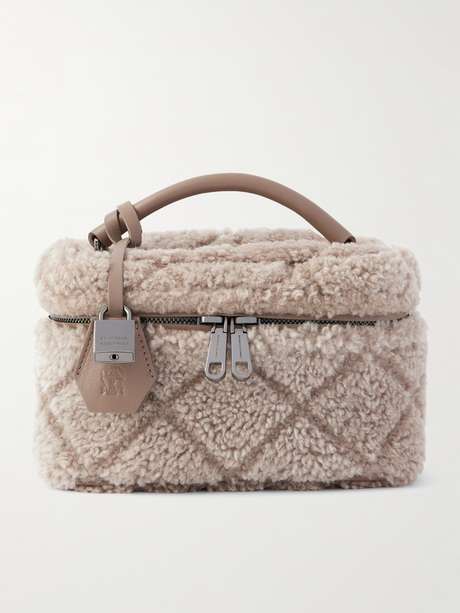 Brunello Cucinelli’s bag is crafted from plush shearling with ah diamond pattern. Designed with a structured leather top handle, it comes with a luggage tag and logo-engraved padlock. The compact, boxy shape offers enough space for your phone, cardholder and keys.