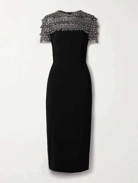 Carolina Herrera's dress does all the accessorizing for you, thanks to the scores of sparkling crystals along the tulle neckline and sleeves. It's made from smooth crepe for a slim fit and has a defined waist and pencil skirt. Wear yours with point-toe heels.