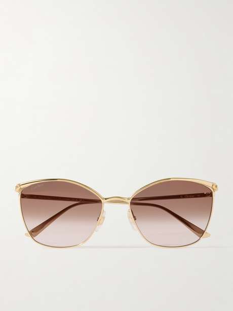 Cartier Eyewear's 'Panthère' sunglasses are identifiable by the signature panther that sits atop each temple. Cast in an oversized cat-eye shape, they're made from gold-tone metal that's buffed and polished for shine.