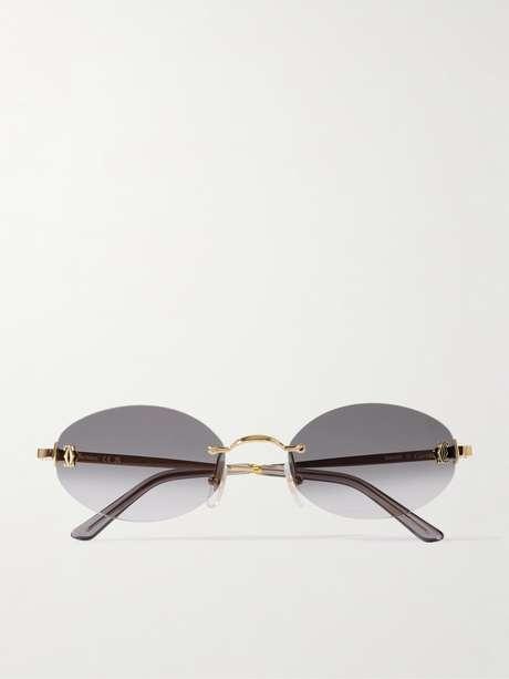 The rimless profile and tinted lenses of Cartier Eyewear's 'Double C' sunglasses echo vintage styles. They're made from gold-tone metal with oval frames and signature interlocking monikers at each temple. Note how the acetate tips complement the lenses.