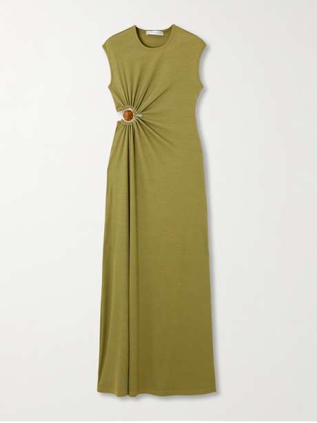 The cutout on Christopher Esber's dress wraps around the back and has signature U-ring and pretty stone just above the hip. It's made from stretchy jersey and has a ribbed finish to accentuate the close fit.