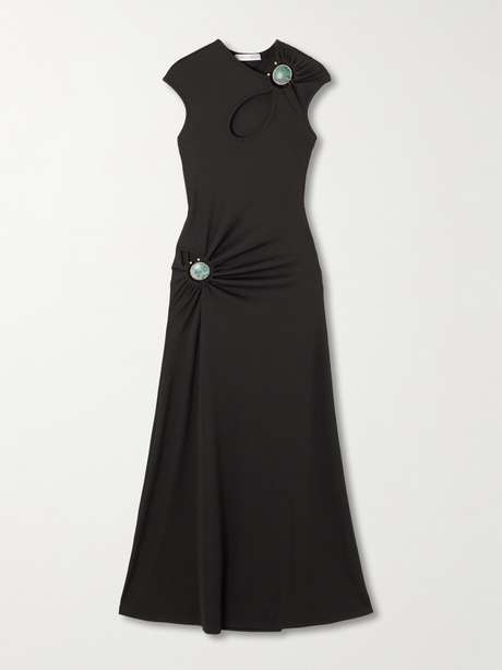 Christopher Esber's dress is spliced with cutouts that show off just the right amount of skin - each one is reinforced with gold-tone U-rings and marbled stones. It's made from ribbed jersey that's lightweight and stretchy and has a close fit.