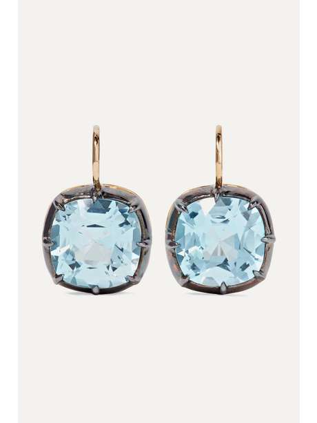 Fred Leighton's 18-karat earrings showcase 8.96-carats of cushion-cut topazes - a square shape with rounded corners. The elegant blue color of the precious stones is enhanced by the silver-topped claws and setting. The hook has a full rounded shape that means this pair sits neatly directly below the lobe.