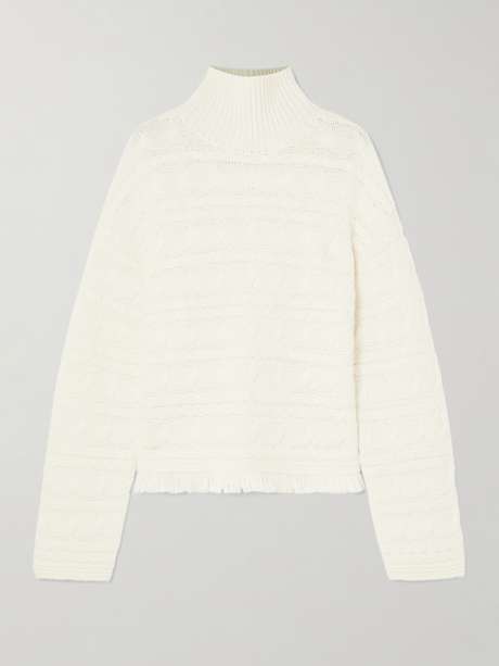 The horizontal cable stitches and fringed hem give Guest in Residence's sweater a tactile feel. It's knitted from a warming wool and cashmere-blend and has a relaxed shape with a cozy turtleneck.