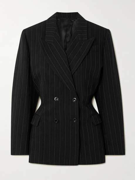 Isabel Marant’s Fall ’25 runway infuses the label’s signature bohemian charm with a bold 'New Wave edge'. Styled for the runway with lace tights and statement brooches, this pinstriped 'Maia' blazer is tailored from cotton-blend herringbone in an oversized double-breasted shape that cinches in at the waist for an hourglass effect. Padded shoulders add structure.