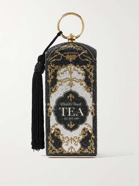 Judith Leiber Couture’s gold-tone clutch is designed to resemble a traditional tea tin, proclaiming this batch as the “world’s finest.” It’s hand-set with scores of sparkling crystals and has a swishy tassel at the top handle. Keep your phone and a few small cosmetics inside.