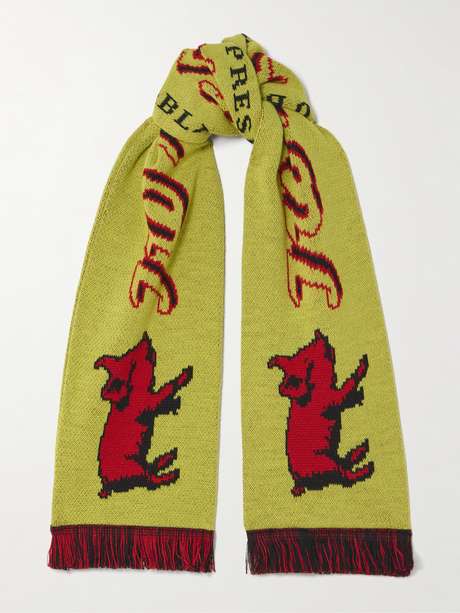 If you've ever been to a soccer match, you'll recognise JW Anderson's scarf – it's inspired by those sold on fan stands. Perfect for wearing with trucker and track jackets, it's jacquard-knitted with logos and piglets and finished with fringed ends.