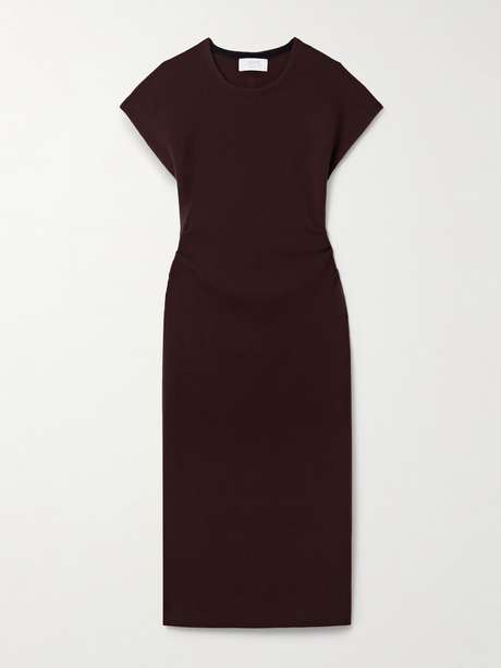 La Ligne's dress is subtly ruched along the sides, adding shape and definition to the otherwise simple design. It's made from soft, plush merino wool in a rich chocolate shade and has seamless cap sleeves. Style yours with neutral accessories.