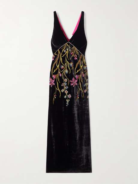 For decades, Loretta Caponi has been admired for its intricate hand-embellished details which pay homage to the founder's own skills. This midi dress is cut from plush velvet decorated with sparkling crystals and vivid floral motifs that trace the fitted body and skirt. Complement the colorful blooms with striking accessories.