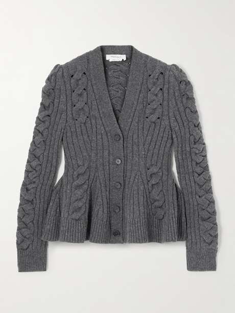 Alexander McQueen’s cardigan is knitted from a soft wool and cashmere blend with intricate cable stitches. Cut for a slim fit, it’s shaped with a flared peplum hem that adds subtle structure to the silhouette.