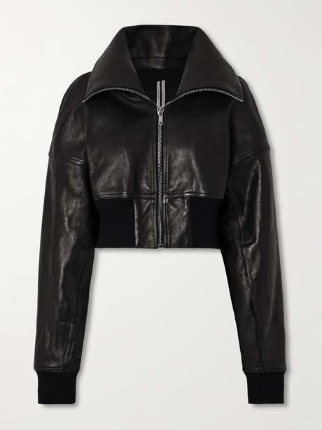 Rick Owens refers to the exaggerated funnel neck of this jacket as a ‘Dracucollar’—a dramatic detail that defined the Fall ’25 runway. Crafted from supple leather, it’s finished with ribbed trims that accentuate the cropped silhouette.