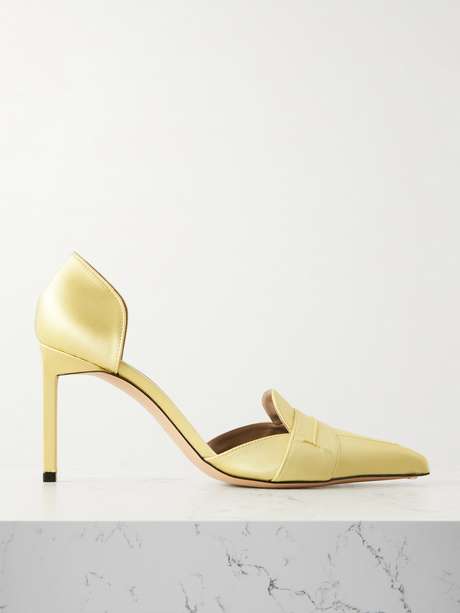 TOM FORD's 'Eva D'Orsay' pumps were seen on the Fall '25 runway. Made from smooth satin, they have loafer-style vamps, slender pointed toes and 105mm stiletto heels.