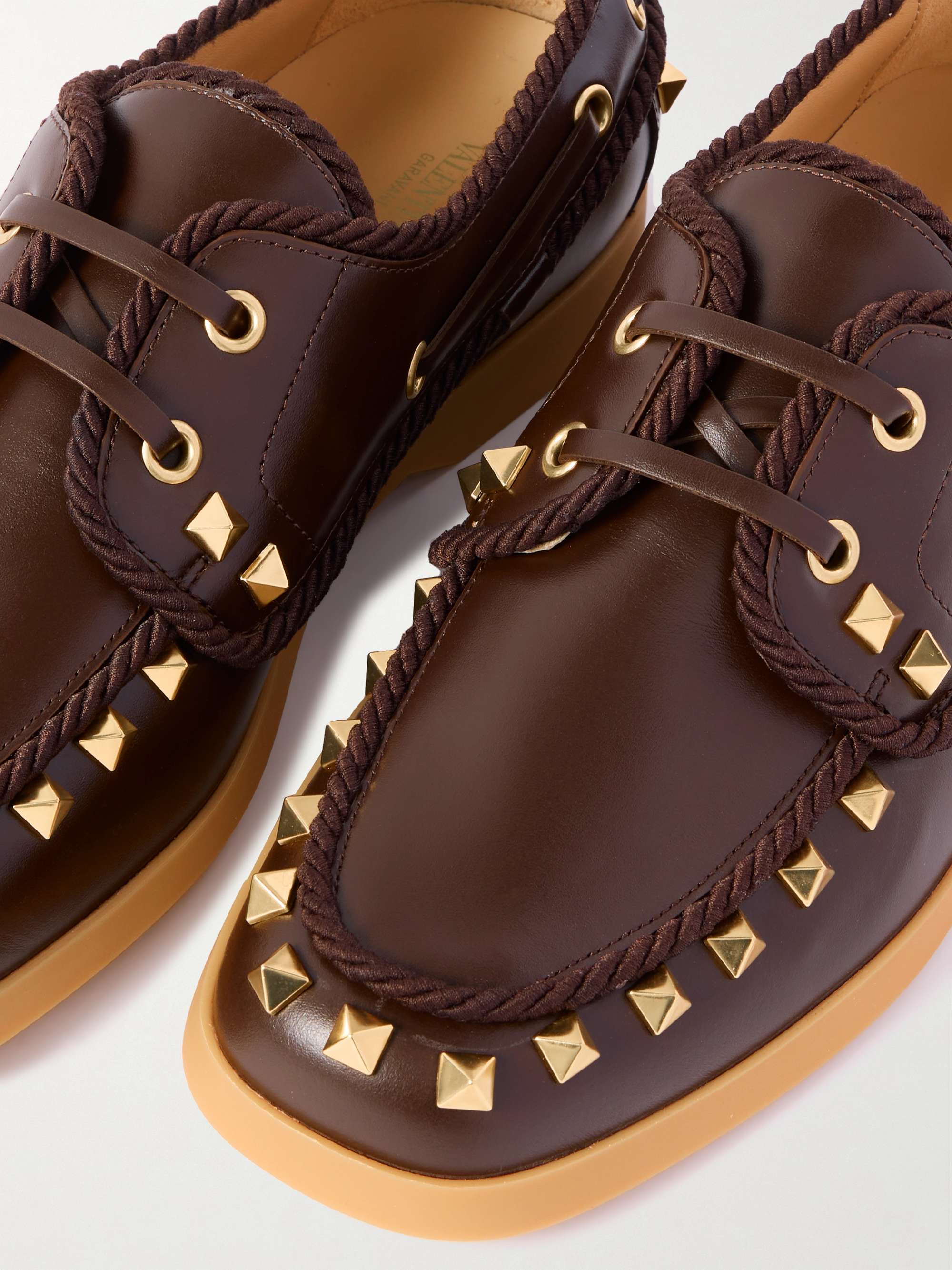 Valentino Garavani's signature studs add a punkish edge to these sophisticated 'Palm Avenue' loafers. Modeled after boat shoes, they're made from smooth leather and outlined with twisted rope trims. Wear yours with a linen set on vacation.