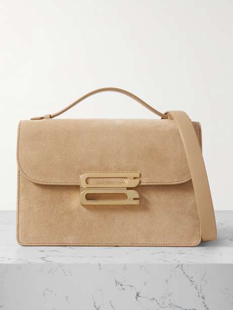The leather shoulder strap on Victoria Beckham's 'Dorian' bag is removable, so you can hold it by the top handle if you prefer. It's made from sand suede and features the label's signature 'B Buckle' hardware that doubles as a fastening at the front. Inside you'll find two compartments to easily organize your phone, cardholder, lipstick and mints.