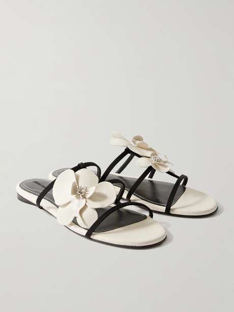 Zimmermann's slides have black grosgrain straps appliquéd with leather shaped to look like blooming orchids. They have lightly padded insoles and a slight heel for lift.