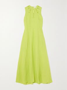 Indeed, a minimal linen dress is the effortless warm-weather style solution you’ll wear on repeat – from baking-hot city breaks to beach days. Try Zimmermann’s supremely elegant ‘Halcyon’ cutout midi, which comes with ruffle straps and ties tipped with cowrie shells, or look to Bondi Born’s papaya-orange ‘Montenegro’ strapless woven maxi, which features in our NET SUSTAIN edit of consciously crafted fashion. For beach-ready styles, lightweight iterations of the fabric are ideal. Le Kasha’s ‘Assiout’ belted maxi dress is made from a delicate linen-gauze that’s spun with gold threads, so it glistens in the sunlight. Slip yours on over a bikini to go straight from the waves to lunch beside the water.