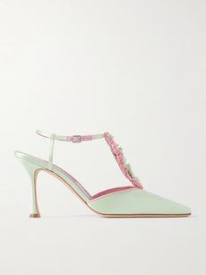 It’s easy to imagine Marie Antoinette, who famously received four new pairs of shoes a week early on in her reign, gliding around the Palace of Versailles in styles from this 17-piece capsule, and yet they will slot seamlessly into modern wardrobes, too. There’s the ‘Montmedy’ pumps – a reimagining of an original pair Blahnik designed for Coppola’s biopic, this time updated in an exclusive black colorway and a multi-colored, authentic lampas pattern that is often seen on the queen’s furniture; the ‘Nolhac’ boots decorated with velvet ribbon that nods to her tightly laced corsets; and the appliquéd ‘Palissot’ sandals – one of nine NET-A-PORTER exclusives. The ‘Rohan’ pumps, however, are Blahnik’s personal favourite. Designed in pastel, Rococo-pink tones inspired by the famous rose garden at Versailles and Antoinette’s powdered cheeks, they epitomize the very essence of the collection.