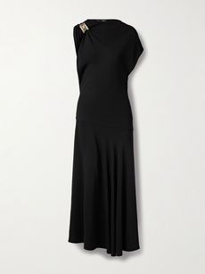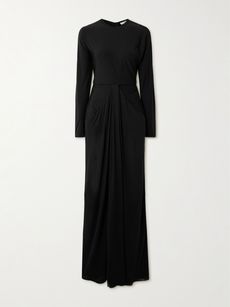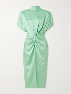 “What I believe in very much, as a female designer, is: you leave work and you party,” Stella McCartney told fashion journal WWD backstage, following a fall/winter ’25 show that saw classic gray coat dresses paired with glossy thigh-high boots. “The day-to-night thing is really important for my brand.” Also debuted on McCartney’s fall runway is this lustrous mint-green midi with statement padded shoulders and a twisted front that cinches the waist – a piece that will work overtime in your wardrobe. “This dress looks sensational – from the color, to the draping, to the power shoulders and silhouette,” McCartney told PORTER. “And you would never know it was in a sustainable fabric,” added the designer, who is known for her dedication to consciously crafted luxury. “This dress is in forest-friendly viscose satin, which is made from sustainably sourced wood pulp – crazy! This is a material we have invested a lot of time and money into. We have created our own supply chain, and it’s woven exclusively for us by mills in Italy. For me, this is proof you should never have to sacrifice on design or style to protect Mother Earth.”