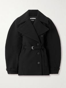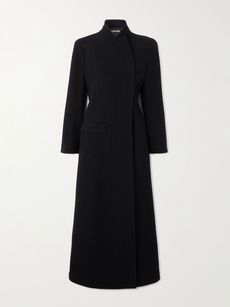 This interplay between volume and draping is key. Alaïa has always mastered this with utter perfection. In fact, the late couturier Azzedine Alaïa initially trained to be a sculptor, going on to ‘sculpt’ and mold his designs directly onto the body. Current creative director Pieter Mulier paid homage to the house’s heritage for fall/winter ’25 with his rolled-waist pleated skirts that swished, swayed and seemed to hover weightlessly around the body. If they feel a little avant-garde, the pale-blue midi dress that Sasha Pivovarova models in our PORTER shoot has all the Alaïa hallmarks in a slightly more subtle form – the high neckline and clever ruching below the waist create an hourglass shape. Layer Tom Ford’s sleek double-breasted wool-bouclé coat on top to anchor the litheness of the dress with architectural precision.