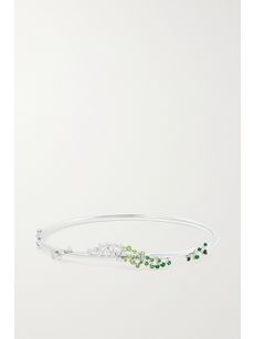 Ananya’s jewelry is every bit as glamorous as the jet-setting designer herself – who is based between London, Miami and Chennai – and there’s depth behind the dazzle. She’s inspired by the flow of energy between the chakras: in the Scatter collection, gemstones float in ethereal formations around the earlobes, wrists and fingers, with multicolored sapphires creating a subtle ombré effect. Her signature ‘Chakra’ bracelets combine jade beads or pearls with diamond-set or quartz-crystal bars, each material selected for its healing properties. They’re best worn stacked for maximum impact.