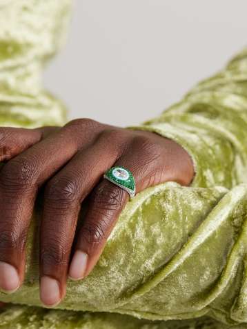18-karat white gold diamond, emerald and enamel ring