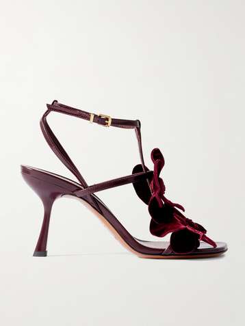 Orchid appliquéd velvet-trimmed glossed-leather sandals
