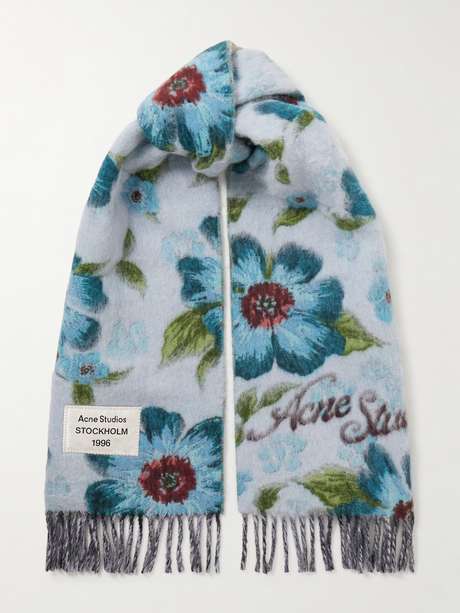 Acne Studios' scarf is made from wool-blend that's brushed to enhance its soft handle. Patterned in pretty blooms, it has fringed edges and is appliquéd with the brand's '1996' logo patch.