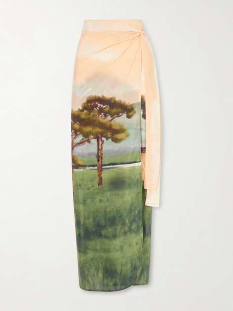 The Agua by Agua Bendita pareo is designed with an effortless, wrap-around ease that feels both relaxed and elevated. Tied at the waist, it drapes fluidly along the body, creating a soft, elongated silhouette with natural movement.