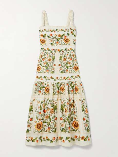 AGUA BY AGUA BENDITA Nispero tiered embroidered printed linen midi dress