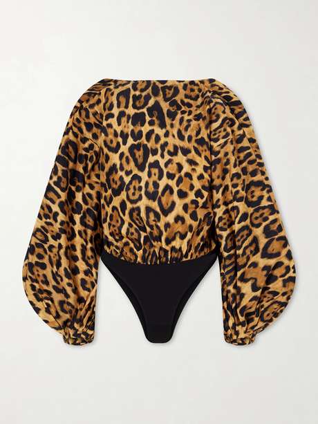 Restraint and expression converge through refined craft in Alaïa Spring ’26. Cut from lightweight taffeta in a striking leopard print, this bodysuit has a backless silhouette and voluminous balloon sleeves that create movement and drama.